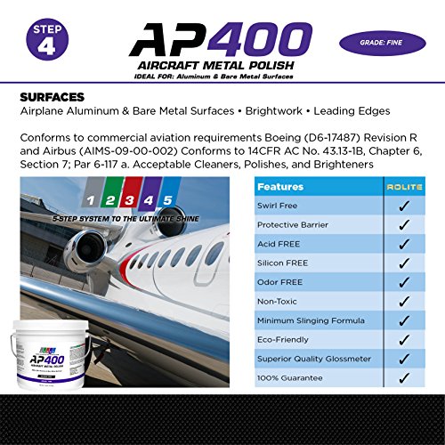 ReleaseDate : 2017-09-20 Studio : Rolite Company Publisher : Rolite Company Binding : Misc. Product Description AP400 Aircraft Metal Polish Step 4 of the AP 5,Step System To The Ultimate Shine Directions: Some settling may occur during shipping, stir before using For best results, apply 1 teaspoon of AP400 Aircraft Metal Polish to Aluminum (Clad or Mil grade) and bare metal surfaces with a clean, dry microfiber cloth ? do not use water When using an electric buffer, use a clean, soft, free of dust buffing pad Work one 4,5 sq ft section at a time Apply as needed For maximum shine, buff off immediately while AP400 Aircraft Metal Polish is still moist ? do not let dry Minimum slinging formula Product sold by weight not volume Follow up with AP500 Aircraft Metal Polish For best results, use this product as part of the AP 5,step system The 5,step system works synergistically to provide ultimate shine and protection 0