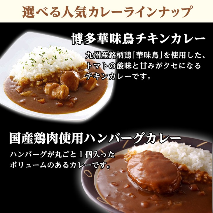 | セット内容 | カレー5種類から選べる2人前お試しセット ・博多華味鳥チキンカレー(中辛)200g×1人前 ・赤ワインたっぷりハヤシビーフ200g×1人前 ・国産鶏肉使用ハンバーグカレー200g×1人前 ・オリジナルビーフカレー(辛口)200g×1人前 ・オリジナルビーフカレー(甘口)200g×1人前 |