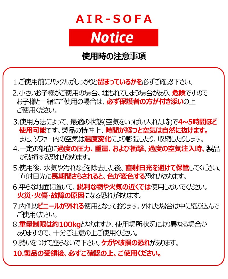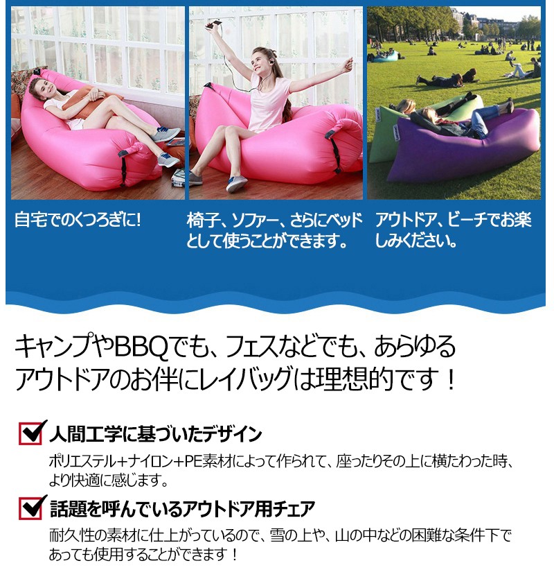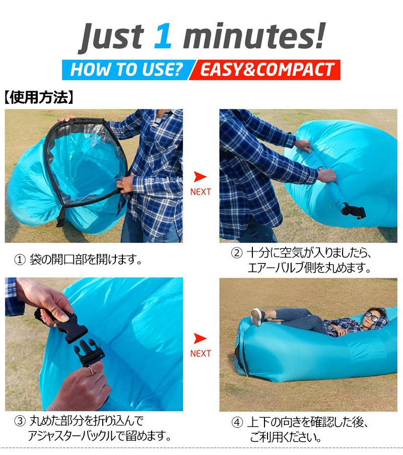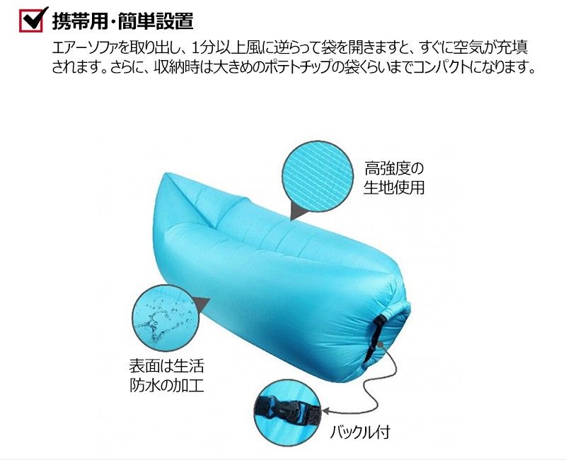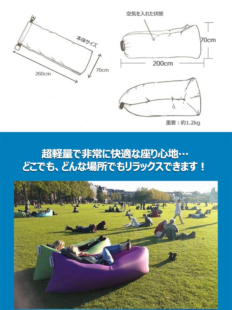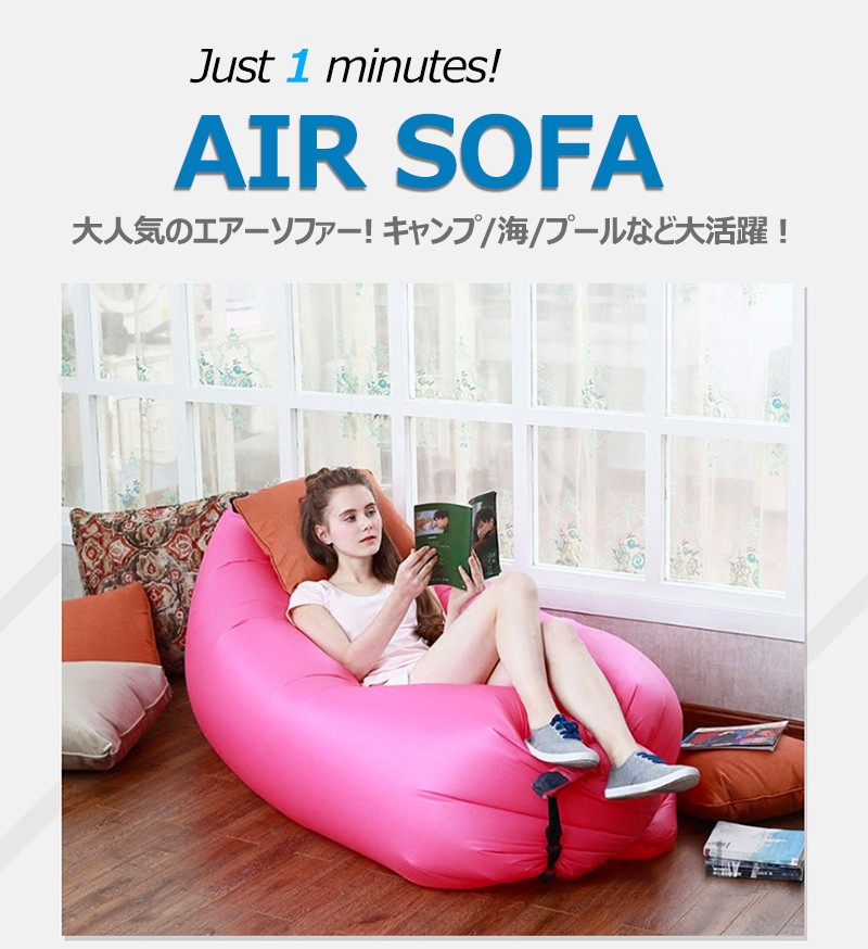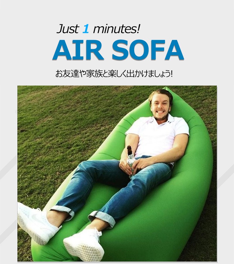 | 商品説明 | 大人気のエアーソファー! キャンプ/海/プールなど大活躍!空気を一気に入れるだけ!Just 1 minutes! |