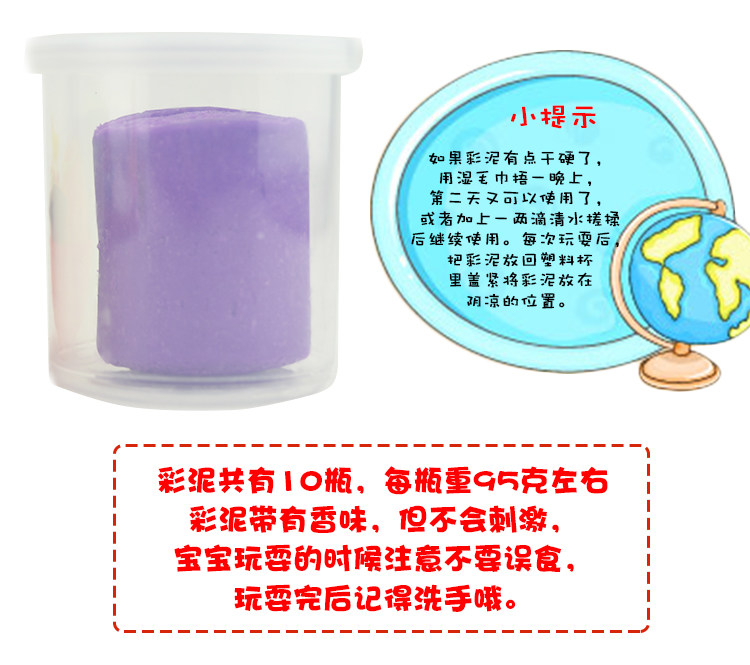 1,彩泥内含水分,请在每次使用之后,放回彩泥罐中密封保存,否则可能因水分挥发导致彩泥变硬。