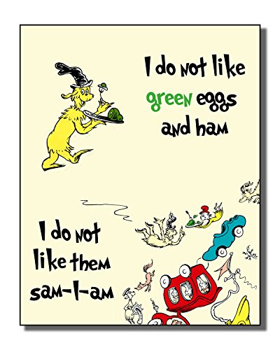 Adorable set of 4 Dr. Seuss themed prints from four popular books: Cat in the Hat, One Fish Two Fish Red Fish Blue Fish, Oh the Places You'll Go and Green Eggs and Ham.