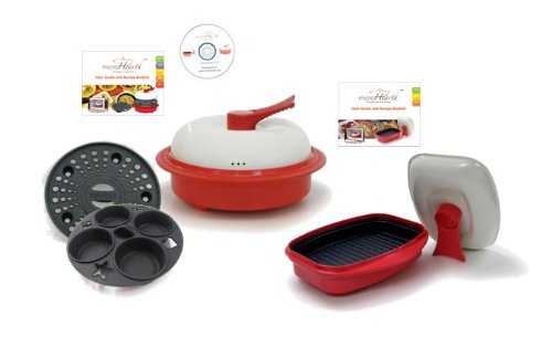 Microhearth is a revolutionary cookware for a microwave. With Microhearth, you can now grill, bake, boil, sauté, stir-fry and steam in a microwave. Your grilled steak, steamed vegetables, boiled eggs, poached fish, grilled or even fried fish and muffins are prepared and cleaned up in 15 minutes or less for a meal. No mess, no spatter, no smell permeating the room. What's better than keeping all the nutrients in your food so that you ingest them, not pour them out down the sink. Also, its cooking results may surprise you. The results are moist and flavorful foods that utilize the microwave oven's convenience; while enduring natural flavor and freshness. You'll find this cookware set easy to use and will soon become a favorite in you kitchen. A wise investment saving you both time and money. With Microhearth cookware set, you can now enjoy your favorite foods and recipes at anytime and at wherever microwave oven is accessible. It is even great for RV, school dorm and break room. Microhearth Pan is durable and high-heat resistant that components that nest together making it versatile and compact for easy storage. The durable body is formulated to safely perform under hottest temperatures. Ceramic-coated metal Lid with standing handle allows you to conveniently rest it upright so moisture does not drip on the counter. Ceramic-coating is especially designed for use in the microwave and eliminates the "microwaves" that normally causes dryness by penetrating through the food during cooking. Cookware Set included: Everyday Nonstick Pan and Ceramic-coated Lid, Silicone Muffin Pan, Silicone Steam Pan, Everyday Pan recipe booklet, instructional DVD and Nonstick raised ridge surface Grill Pan and Ceramic-coated Lid, Grill Pan recipe booklet.Feature