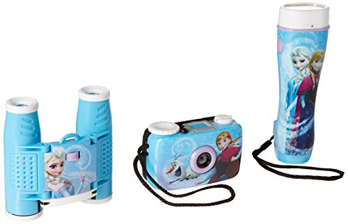 Disney's Frozen Adventure Kit contains essentials for any adventure! Includes a flashlight that illuminates up to 10 feet for night excursions (needs 2 AA batteries-not included), 35mm camera and compact 4 X 28binoculars.Feature