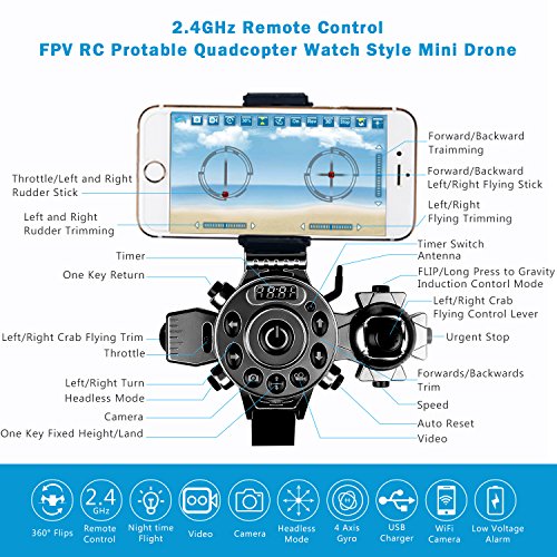 Arvin Remote Control Drone ,Portable Mini Helicopter with Wearable Watch Remote Foldable Drone 4 Axis FPV Camera 0.3MP Aerial Photography/Altitude Hold/ Auto Return and Real-time transmission Specifications: >Controller: 2.4GHz