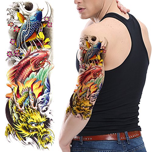TAFLY Colorful Koi Carp and Dragon Temporary Tattoo Waterproof Stickers Fish Full Arm for Men 2 Sheets