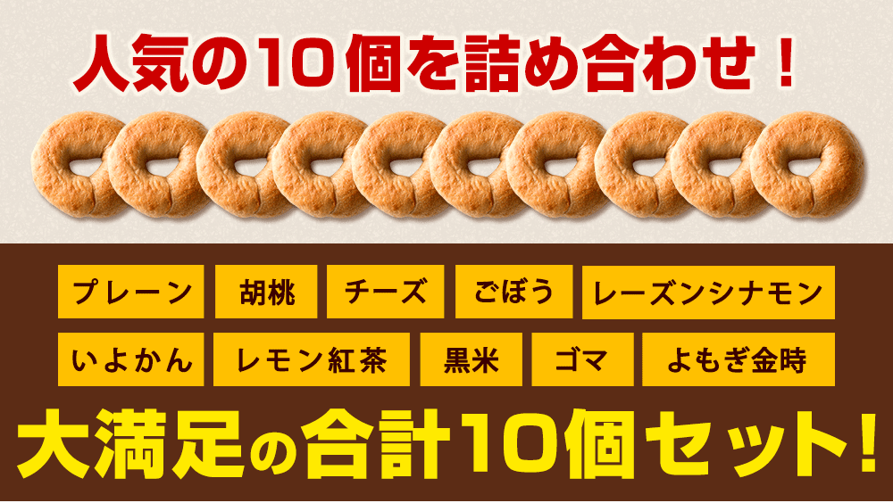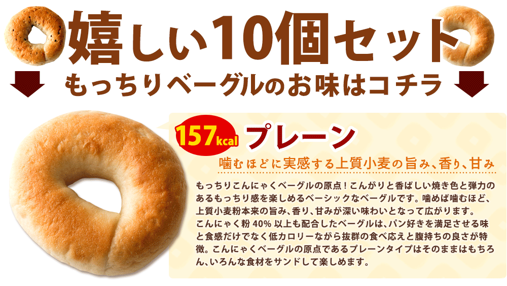 こんにゃくベーグル10個セット(ププレーン、くるみ、胡麻、チーズ、よもぎと金時豆、レモン紅茶、いよかん、黒米、ごぼう、レーズンシナモン) |