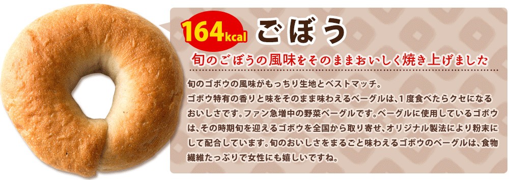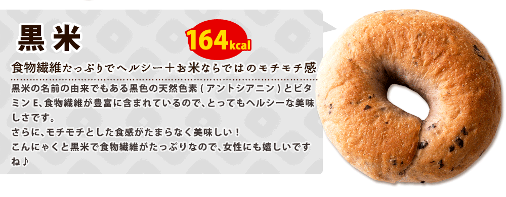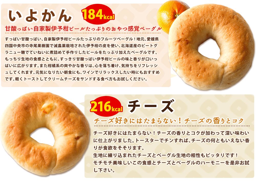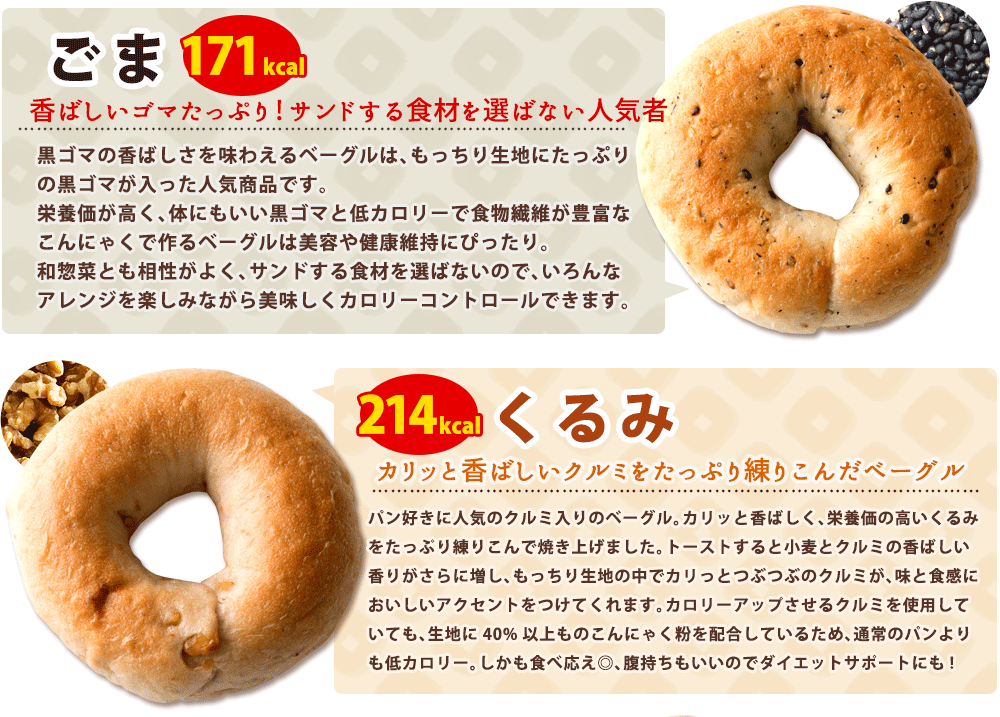 プレーン:157kal くるみ:214kal 胡麻:171kal チーズ:216kal カレー:157kal レーズンシナモン:172kal レモン紅茶:184kal いよかん:184kal 黒米:164kal |