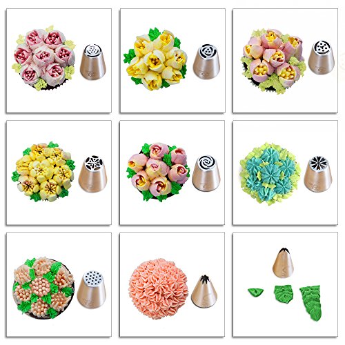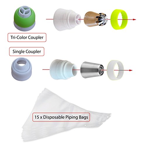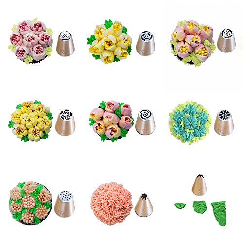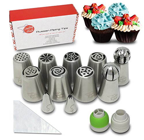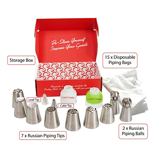 - 7 Russian Piping Tips - 2 Russian Piping Balls - 1 Leaf Tip - 1 Cake Tip - 1 Single Coupler - 1 Tri-Color Coupler - 15 Disposable Piping Bags Unwind in your kitchen and create something spectacular to share with your friends and family. It's the perfect tool to craft incredible looking cakes and cupcakes for birthdays, anniversaries, baby showers, holidays, bake sales, and more!
