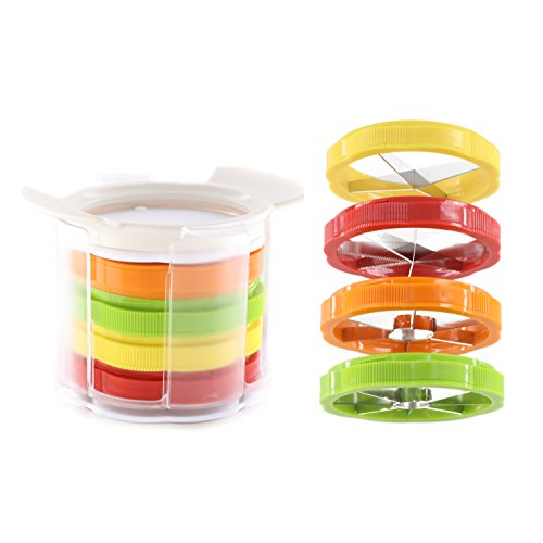 Products Include: 1 handle, 4 fruit slicers, 1 non-slip cutting board, 1 storage box, the diameter of the slicer is about 3.93in.