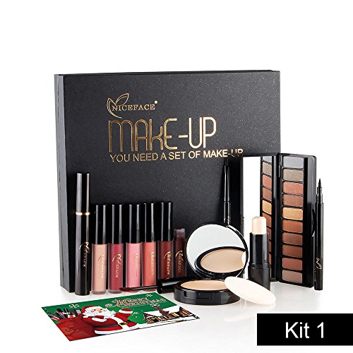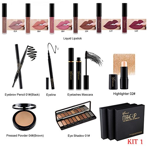 -. Feature : CHRISTMAS GIFT SET DESIGN: Xmas gift card inside the box, it's best choice for Xmas gift for girls. / Package Included: 6-shade liquid lipstick+eyebrow pencil+eyelash mascara+eyeliner+highlighter+pressed powder+eyeshadow palette+Gift card / Kit 1: liquid lipstick(01#,03#,07#,09#,12#,13#), eyebrow pencil(01#), highlighter(02#), eyeliner, eyelashes mascara, pressed powder(04#), eye shadow(01#), Christmas card / Kit 2: liquid lipstick(01#,06#,08#,10#,12#,14#), eyebrow pencil(02#), chubby blush(06#), eyeliner, eyelashes mascara, pressed powder(01#), eye shadow(06#), Christmas card / Kit 3: liquid lipstick(02#,03#,06#,10#,16#,24#), eyebrow pencil(03#), highlighter(01#), eyeliner, eyelashes mascara, pressed powder(02#), eye shadow(05#), Christmas card