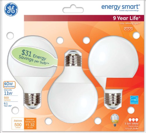 Studio : GE Lighting Publisher : GE Lighting Binding : Tools Home Improvement Product Description The GE energy smart globe CFLs feature a GE Spiral bulb on the inside that uses 75% less energy and lasts up to 5 times longer than incandescent globes. GE energy smart globes' decorative round shape is perfect for illuminating pendant and vanity fixtures. 0