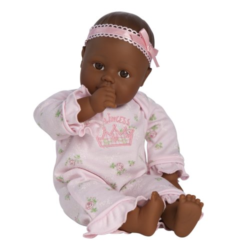 Feature : This "Little Princess" is a loveable and cuddly first baby doll at 13-inch is perfect for little ones ages 1 and up to hold and cuddle / Soothing Satin body, bean bag "bottom" and life-like baby power scented vinyl / She has open close eyes and can suck her thumb for realistic nurturing and play / Her removable pink floral sleeper is embellished with embroidered "Princess" and a crown / This brown eyed sweetie with a dark skin tone is Hypo-Allergenic and even Machine Washable, she can always be fresh and clean and ready for play