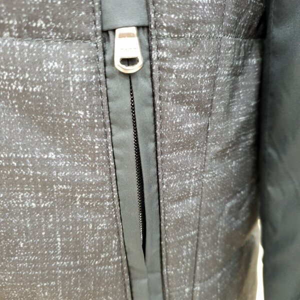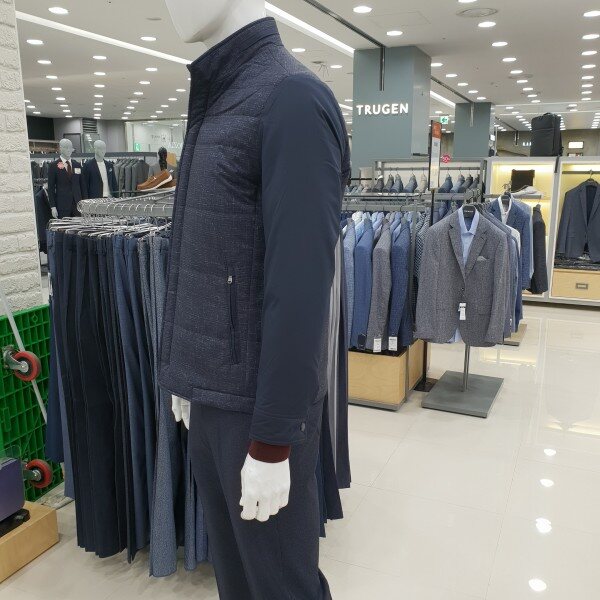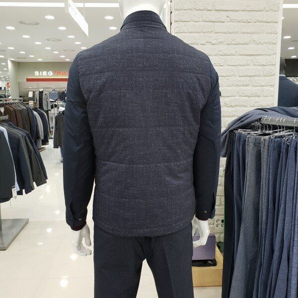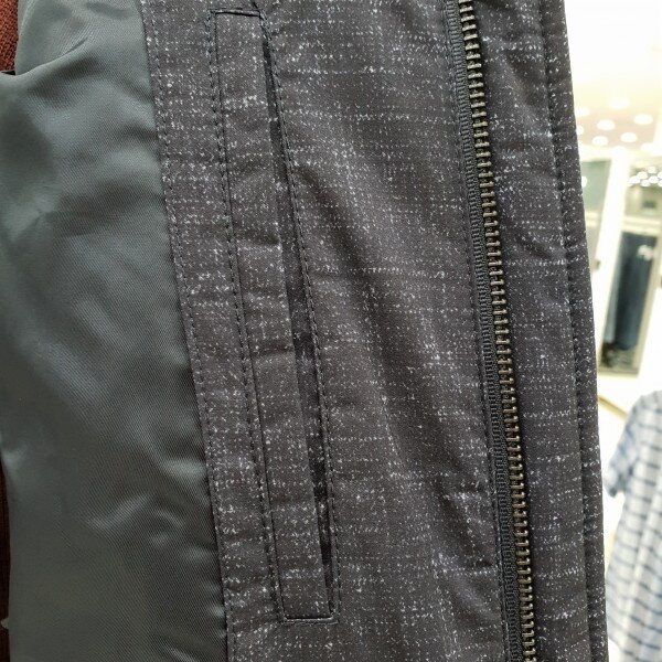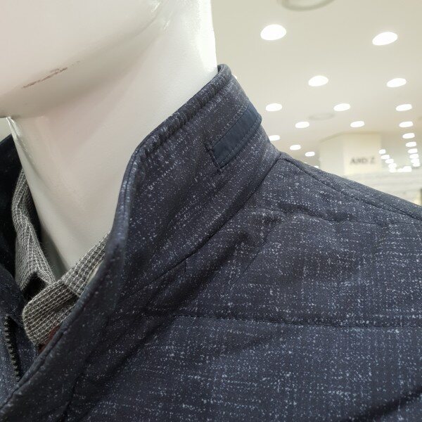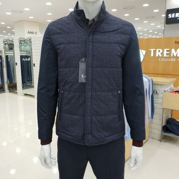 . 베이직한 스타일의 소매배색 가을용 패딩 점퍼입니다. 앞몸판은 은은한 프린트의 폴리 원단, 소매는 솔리드 폴리 원단을 사용하였 습니다