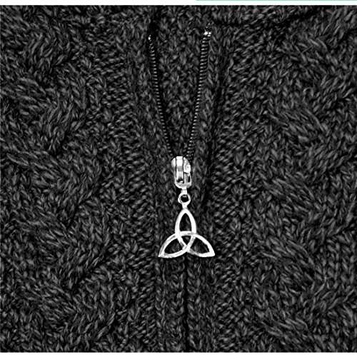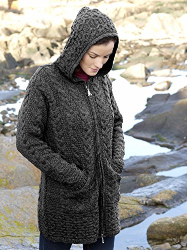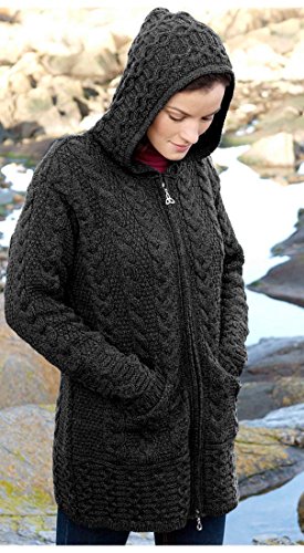 Binding : Apparel Product Description This three quarter length, Irish double zip knitted cardigan comes in Charcoal and Natural. The hood and insert pockets make it practical, cosy and very wearable, a must have. The Celtic knot design on the zip puller is an attractive feature. The ladder stitching between the Irish cables signifies various stages of life. The various size and direction of the Irish cabling is very slimming for the wearer. A real autumn/winter warmer. 0