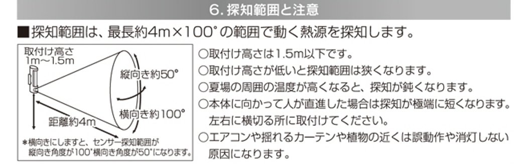 ● Detection range detects heat source moving in the range of maximum 4m × 100 degrees (※ note) Installation height is 1.5m or less