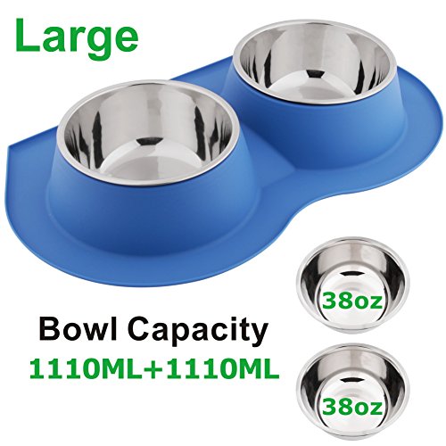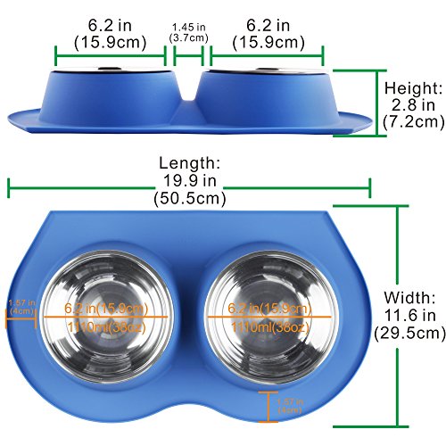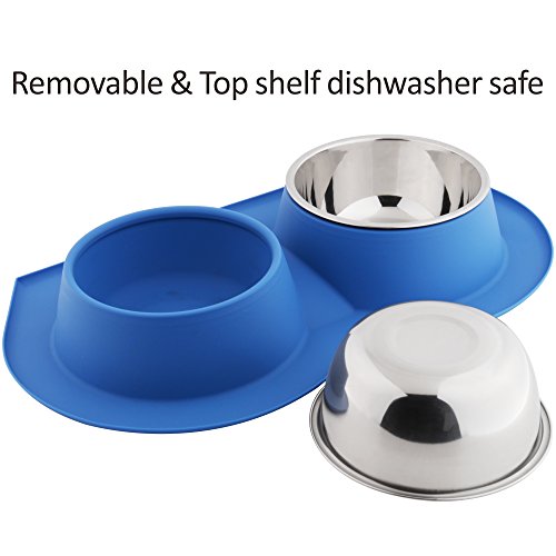 √ 100% Leadfree, BPAfree, FDA approved silicone and stainless steel √ Spill Skid Proof Silicone Base Design, protecting floor from scratches and water damage √ Proper Hygiene-Double bowl Design Keep Food and Water Separately √ Easy to clean and Top rack dishwasher safe √ Great for Medium and Large Dogs and Cats