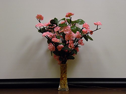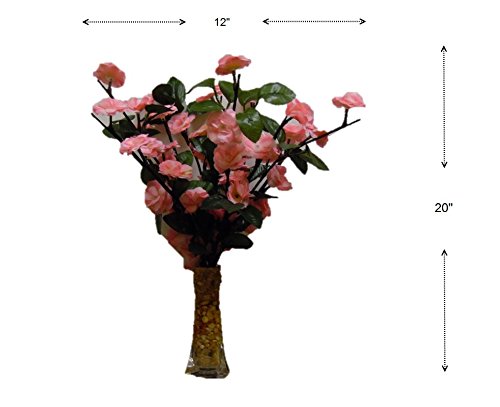 - The pink rose flower branch mounted in acrylic vase with rocks. The floral arrangement stands approximately 20" high and has a 12" spread at the top.