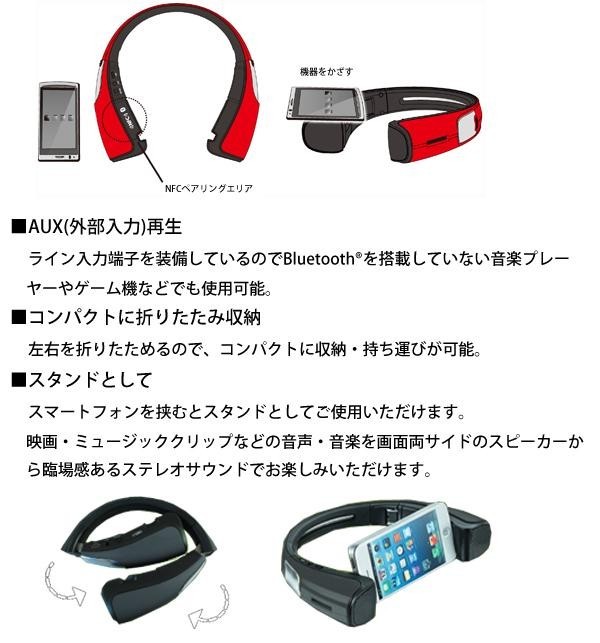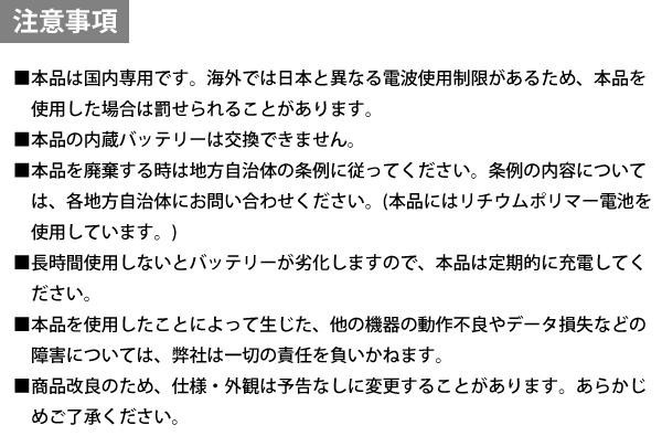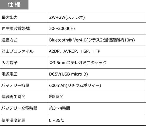 | 仕様 | 最大出力:2W+2W(ステレオ) 再生周波数帯域:50〜20000Hz 通信方式:Bluetooth(R) Ver4.0(クラス2:通信距離約10m) 対応プロファイル:A2DP、AVRCP、HSP、HFP 入力端子:Φ3.5mmステレオミニジャック 電源電圧:DC5V(USB micro B) バッテリー容量:600mAh(リチウムポリマー) 連続再生時間:約5時間 バッテリー充電時間:約3〜4時間 使用温度範囲:0〜35度 |