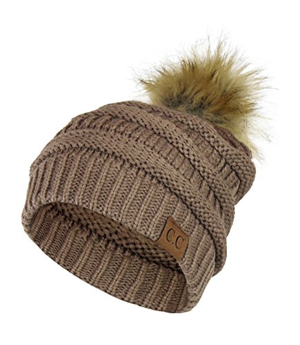 -. Title : Chunky Cable Knit Beanie Hat w/ Faux Fur Pom Pom - Winter Soft Stretch Skull Cap