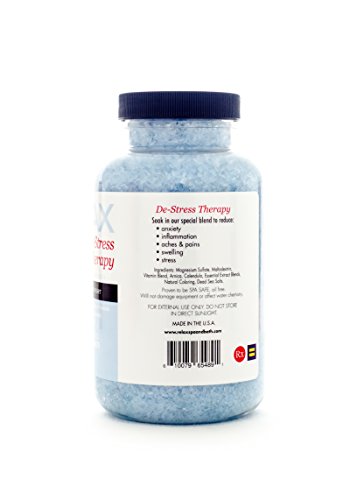 -. Feature : De-Stress Therapy - 19 Oz Bottle - All Natural, Therapeutic Bath Crystals - Perfect to De-Stress, Relax, & Calm / Powerful Aromatherapy with Natural Coloring - Enhances Relaxation - Vitamin Enfused / Remedy for Aches & Pains - Reduce Tension & Stress - Enhance Self-Healing & Detoxify / Skin Softening Moisturizers - For Spas, Hot Tubs, Jacuzzis, & Whirlpool Baths - Spa Safe / Does Not Affect the pH or Water Chemistry - Safe For Children & Pets - Will Not Damage, Stain or Affect Equipment or Surface