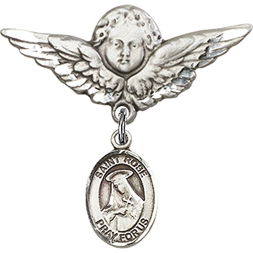 -. Title : Sterling Silver Baby Badge with St. Rose of Lima Charm and Angel w/Wings Badge Pin 1 1/8 X 1 1/8 inches