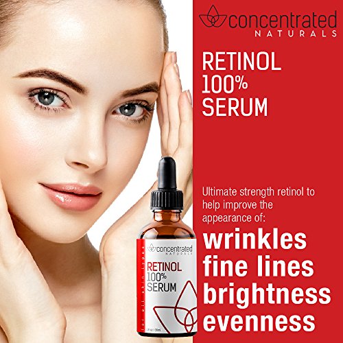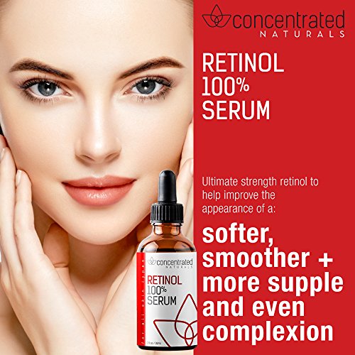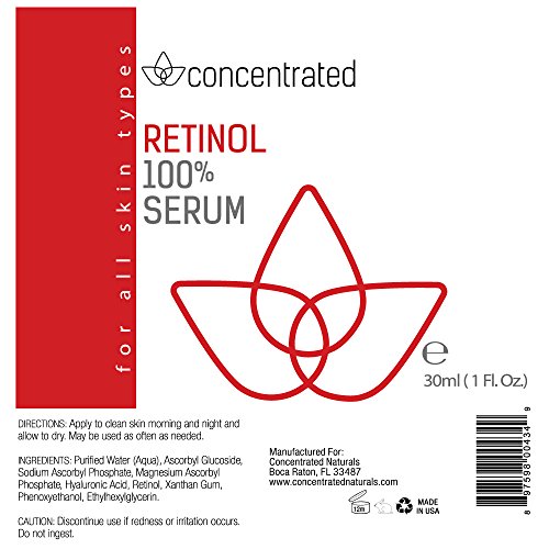 Keep your skin feeling smooth, looking even, youthful and bright using our Concentrated Naturals Retinol Serum for face to help fade the appearance of fine lines and wrinkles and balance out appearance of blotchiness and unevenness. Our nutrient rich active ingredient is in 100% serum, with no unnecessary fillers, and contains antioxidants and is suitable for both men and women of all skin types and tones including normal, dry, combination, oily, sensitive, mature, older, fair to darker skin tones such as African-American, Asian, Latin, Indian and Mediterranean. To use, wash face using a gentle cleanser and pat dry. Avoiding direct eye contact, apply a thin layer of serum and allow to dry. Apply once nightly at bedtime. Can be worn under a moisturizer if desired. Will hydrate as it brightens. Store in a cool place. Ingredients: Purified Water (Aqua), Ascorbic Glucoside, Sodium Ascorbyl, Magnesium Ascorbyl, Phosphate, Hyaluronic Acid, Retinol, Xanthin Gum, Phenoxyethanol, Ethylhexlglyerin. Do not ingest. We are fully committed to your happiness, love our Retinol Cream 2.5% Anti-Aging Serum or get your money back! MADE IN THE USA