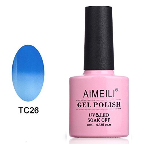 -. Binding : Misc. -. Brand : AIMEILI -. EAN : 0701851249814 -. Feature : 14-day high-gloss wear , On like polish, Wears like Gel, Off in minutes. Mirror shine finish. / No Nicks, Chips or Smudges. / Changes colour with temperature changes. No Nicks, Chips or Smudges / Requires drying under UV or LED Lamp. / Please note: Due to the lighting and screen setting, color may vary slightly from the picture. -. IsAdultProduct : 0 -. Label : AIMEILI -. Manufacturer : AIMEILI -. MPN : TC26 -. PackageQuantity : 1 -. PartNumber : TC26 -. ProductGroup : Beauty -. ProductTypeName : BEAUTY -. Publisher : AIMEILI -. Studio : AIMEILI -. Title : AIMEILI Soak Off UV LED Temperature Color Changing Chameleon Gel Nail Polish - Moody Blues (TC26) 10ml -. UPC : 701851249814