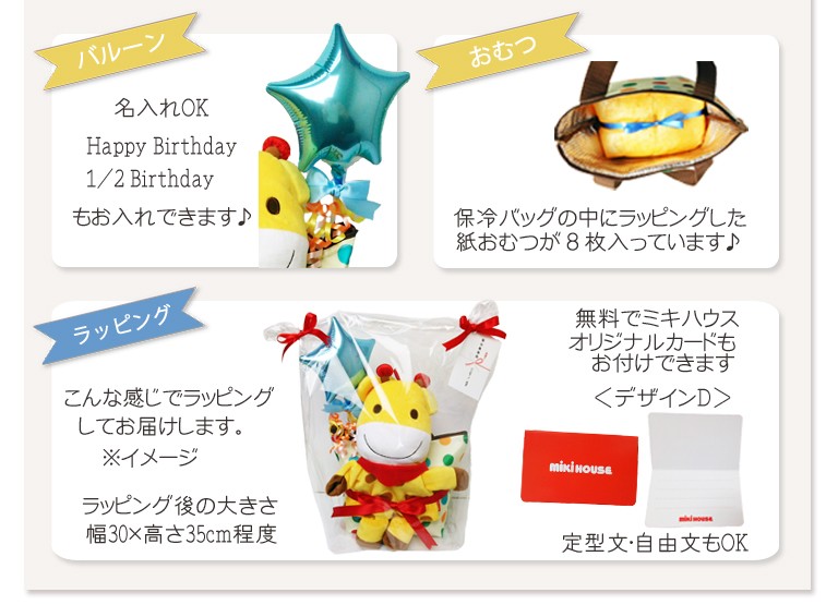 性別問わず使えるパペット&保冷バッグのおむつバッグ出産祝いや1歳のお誕生日プレゼントに。保冷バッグは離乳食を入れたりお出かけ時に便利です。<使用するおむつ> パンパース(テープタイプ:S,M)8枚 パンパース(パンツタイプ:L)6枚程度<付属品> ・mikihouse パペット(手を入れて遊べるぬいぐるみ) ・mikihouse 保冷バッグ ・スターバルーン ・メッセージカード<バルーンへの名入れ> 無料で名入れができます。(ローマ字のみ大文字小文字OK) ※バルーンのカラーは当店でセレクトいたします。 ※小文字13文字程度まで可能。<のし、メッセージカード> 無料でお付けできます。(のしかカードかどちらか) メッセージ内容は当店が用意しました定型メッセージと自由な文面をお選びいただけます。 ※60文字程度までが収まりがいいです。<ご持参用手提げ袋> ご持参頂くのに便利な手提げ袋を無料でお付けできます。 商品の大きさにぴったりな袋を同梱します。<おむつケーキの本体サイズ> 横25cm×高さ25cm出産祝い おむつケーキ ミキハウス mikihouse 名入れ 送料無料 1歳 誕生日