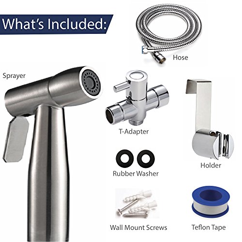 - Includes Screws for Wall Mounting, a Hook Holder for the Bidet, a T-Adapter to Adjust the Water Supply, a Hose, a Sprayer Head, and Detailed Instructions for 5 min Install