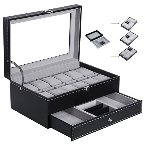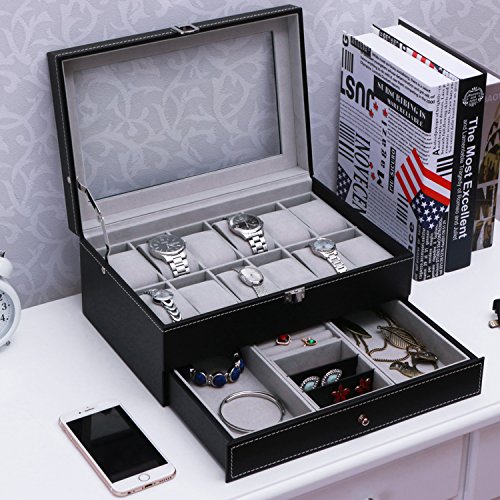 TOP-NOTCH QUALITY & STYLISH LOOK: Made from good quality black PU leather cover, well-done seams, refined interior, smooth actual hinge, see-through real glass top, this well-built watch box is sturdy as well as elegant. Your beloved must be very happy when receiving such a nice gift at birthday or Christmas