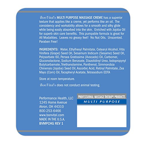 Studio : TheraBand Publisher : TheraBand Binding : Misc. Product Description Bon Vital´Multi Purpose Massage Creme - has a superior light whipped texture that applies like a creme and performs like an oil. The consistency and workability allows for a smooth and silky glide while being easily absorbed into the skin. Enriched with Jojoba Oil for excellent skin care benefits. This pumpable formula is great for all types of modalities. No greasy feel! Water dispersible. Paraben Free! 0