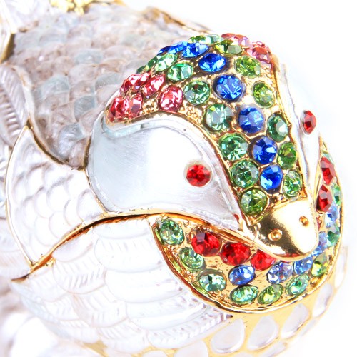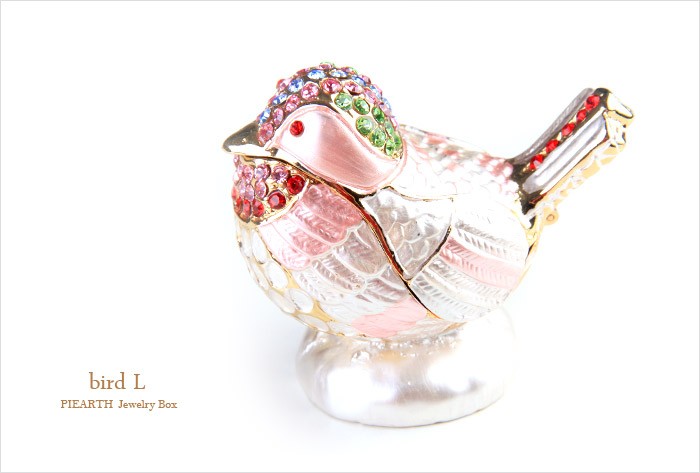| ジュエリーボックスと言えば、指輪やピアス、ネックレスなどのアクセサリーを入れる引き出し型のケースを思い浮かべる方が多いかもしれません。 ピィアースのジュエリーボックスは、動物や花などをモチーフに作られ、合金製でずっしりとした重さがあります。また高品質のクリスタルガラスを贅沢に使用。まるでジュエリーボックスそのものが宝石のような、高級感溢れる仕上がりです。 小物入れとしても使えるように開閉口には磁石が取り付けてあり、アクセサリーなどなくしやすいアイテムの収納ができます。キラキラと美しく輝く宝石箱は、そのまま飾って楽しめるインテリア雑貨として多くの方に愛されています。 国内トップクラスのジュエリーボックスメーカーであるピィアースは、2004年ごろから本格的に宝石箱の製造を始め、現在のジュエリーボックスはなんと300種類以上。大規模展示会でもご好評いただいており、全国有名百貨店でも販売されています。 自社工場でひとつひとつ丁寧に手作りし、原型作成、研磨、加工、着色、小さなクリスタルガラスの取り付けなども全て手作業で行われるこだわりのハンドメイド品。完成後は厳しい検品の後、丁寧に梱包作業をしお客様にお届けしております。 ピィアース商品は、全国有名百貨店および全国有名宝石店チェーンにてお取り扱いいただいている高品質商品です。 ★自分へのご褒美に…コレクションして並べて飾ると、さらにかわいらしさUP! ★恋人へのプレゼント…中にアクセサリーを入れて、サプライズな贈り物として ★家族への感謝ギフト…お母さんや姉妹へ、日頃のありがとうの気持ちを込めて ★誕生日プレゼント…お友達の喜ぶ顔が見たいから、いつもと違うキラキラギフトを ★小さな女の子へ…まるでお姫様が使っているようなキラキラ宝石箱は女の子の憧れ! |