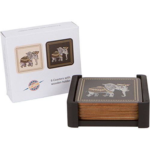 -. Feature : Set of 6 designer coasters. Modern Elephant design with 2 Mix and Match color combo. 3 coasters of each color tone. / Perfect gift for your loved ones or to yourself. These coasters are packed in 'Ready to gift' box which showcases pictures of 2 tone coasters on top. Saves you time and effort. Excellent for those last minute gift situations. / A nice dark color wooden holder included with the pack, making it easier to store and display your nice coasters on any table. Great value. / Nice wide size, almost 4 X 4 inches making it ideal for everything from oversize beer mugs, wine bottles to large coffee cups. Each coaster has soft cork back, making it scratch free for your tables. / High quality shiny lamination really pops the color and design. A good mix of traditional design with modern touch. These coasters are surely going to be a conversation starter.