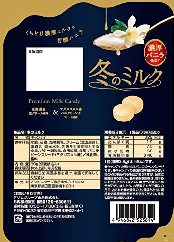原材料:水飴、砂糖、加糖練乳、クリーム(北海道産)、濃縮乳、還元水飴、乳等を主要原料とする食品、バター調製品、食用油脂、食塩、バニラビーンズシード(マダガスカル産)/乳化剤、香料