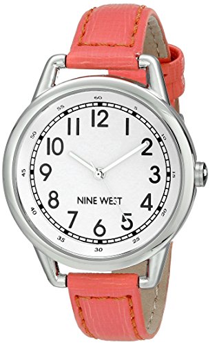 -. Binding : Watch -. Brand : Nine West -. Color : Silver/Coral -. Department : womens -. EAN : 0086702557202 -. Feature : Silver-tone dress watch with coral strap featuring white dial with black Arabic hour markers and P.R.Inted rail-minute track / 38 millimeter Stainless-steel case with mineral dial window / Japanese-quartz movement with analog display / Genuine-leather band with buckle closure / Not water resistant -. IsAdultProduct : 0 -. Label : Nine West -. Manufacturer : Nine West -. Model : NW/1699WTCO -. MPN : NW/1699WTCO -. PackageQuantity : 1 -. PartNumber : NW/1699WTCO -. ProductGroup : Watch -. ProductTypeName : WATCH -. Publisher : Nine West -. Studio : Nine West -. Title : Nine West Women's NW/1699WTCO Easy-To-Read Watch with Coral-Tone Strap -. UPC : 086702557202