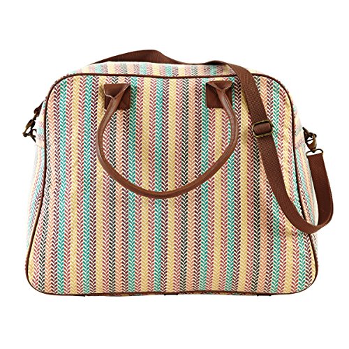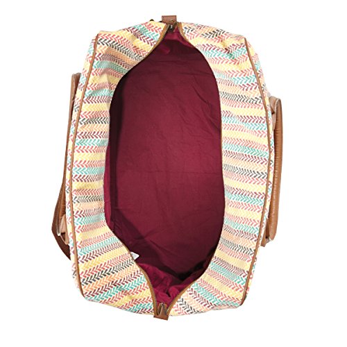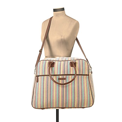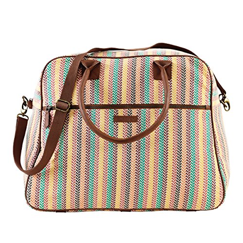 -. Feature : Slightly distressed turquoise, yellow, black, plum, coral and fuchsia colors on a crème canvas base. / Weekender: W 23" x D9" opening, H 14.75" x Base W 20" x D 11" / 2 arm straps 22", 1 removable strap 55" x 1". 10" shoulder drop. / 3 slip, 1 zip inside pockets. 1 outside zip pocket. / 100% Cotton Shell. Straps and trim in brown vegan leather. Spot clean only, no chlorine bleach.