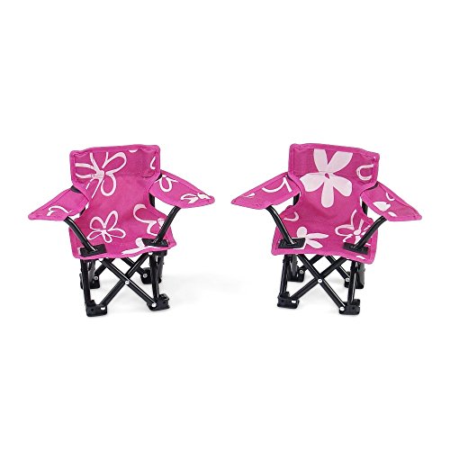 Your 18 inch doll will have fun in the great outdoors with this perfectly sized camping chair set! Sturdy and durable, this outdoor accessories set includes 2 bright pink folding camp style chairs with large beautiful white flowers and a strong frame that opens and closes easily. The chairs can even be used to take to a soccer game or other outdoor sporting event! This amazing set comes with a matching handy drawstring carry / storage case! *Doll Not Included*Feature