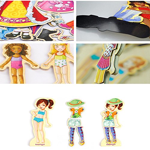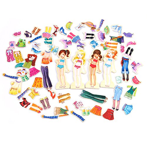 ✔This wooden magnetic doll set included 4 x Wooden Fashion Models(Amber, Jade, Pearl, Amethyst), 63 pieces of clothing.Non toxic, child friendly materials and paint.