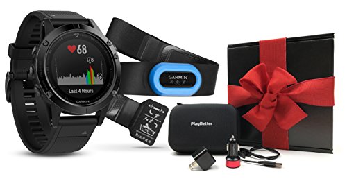 GIFT BUNDLE INCLUDES: Garmin fenix 5 Sapphire Edition (Black with Black Band) Multi-Sport Training GPS Watch, HRM-Tri Chest Strap, Extra silicone QuickFit 22 watch band, PlayBetter USB Vehicle & Wall Charging Adapters, PlayBetter Hard GPS Protective Case, Black Gift Box & Red Bow!