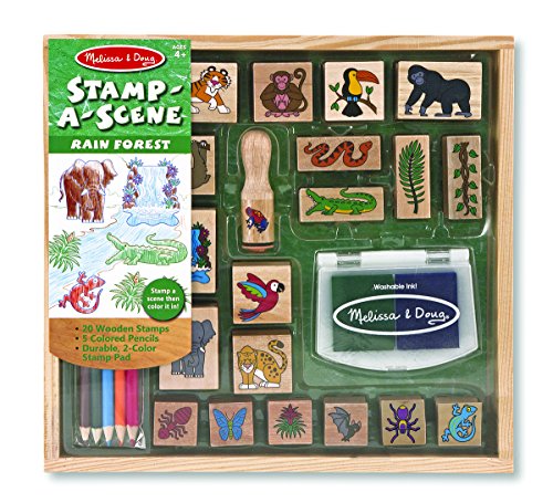Monkeys, snakes, birds and bugs galore combine to create a jungle straight out of your imagination! This extra-large stamp set for kids makes it easy to create an exciting storyline or a color-in scene: It includes 20 rubber-faced, wooden-handled outline stamps and a two-color stamp pad filled with blue and green washable ink. Five colored pencils coordinate with the jungle theme to add details and color in the scene. It's a complete arts & crafts activity and storytelling kit in one!Feature
