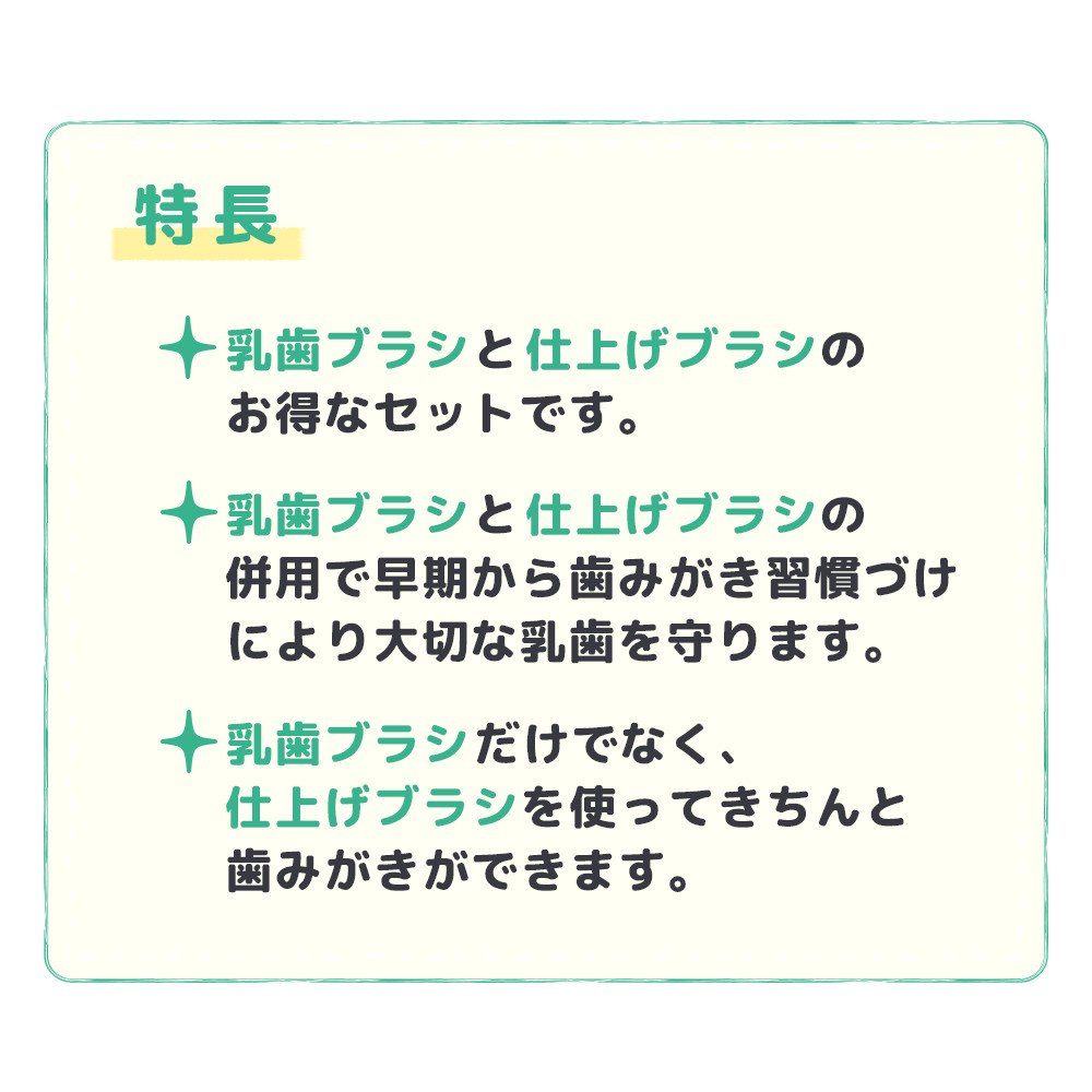 ● By combining infant brush and finishing brush, we will protect precious tooth by precautionary toothbrush habit from early stage.
