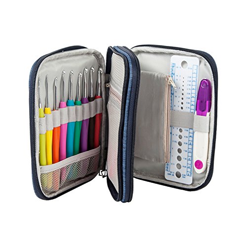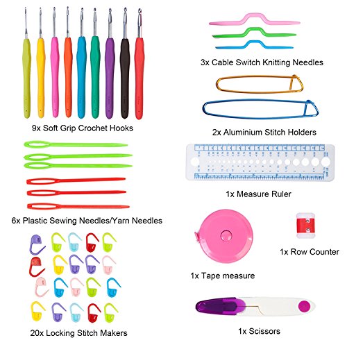 - ♥ PACKAGE - This crochet kit includes the following items: 9 Soft Grip Crochet Hooks with sizes from 2mm to 6mm (2mm, 2.5mm, 3mm, 3.5mm, 4mm, 4.5mm, 5mm, 5.5mm, 6mm), 20x Locking Stitch Makers, 6x Plastic Sewing Needles/Yarn Needles,3x Cable Switch Knitting Needles,1x Row Counter,2x Aluminium Stitch Holders, 1x Measure Ruler, 1x Tape measure, 1x Case, 1x Scissors.