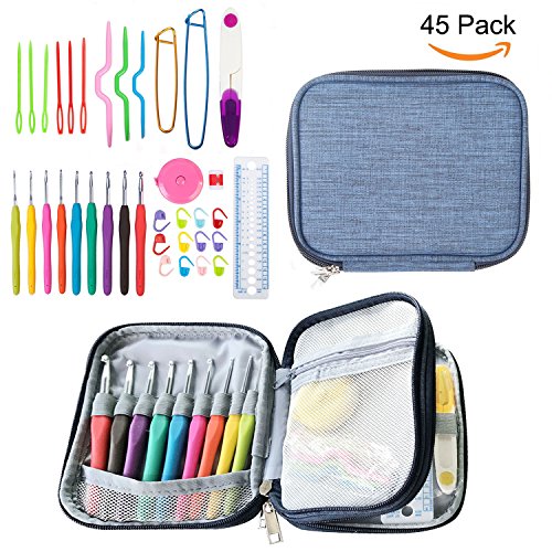 Hombae Crochet Hooks Knitting Needle Sewing Tools Set, 9 pieces Crochet Hooks 2~ 6 mm with Comfort Soft Rubber Grip, 36 pieces Knitting Needle Accessories, Great Gifts for Crochet Lovers (45PCs Set)