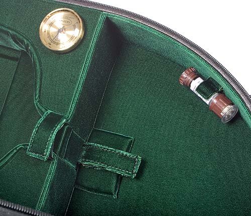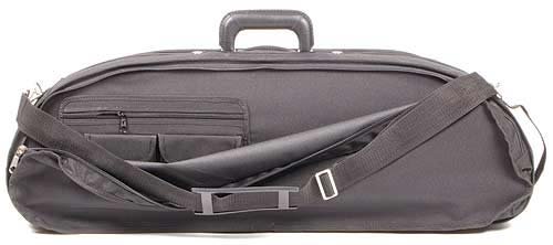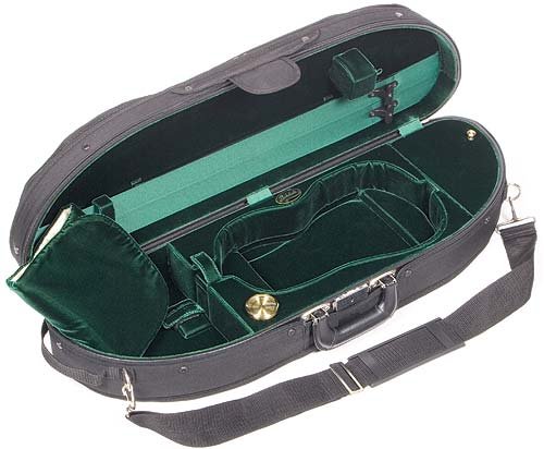 -. Feature : Black exterior with green velvet interior with suspension / A beautifully designed and economical case / Hygrometer, humistat, two bow holders, velcro neck restraint, blanket and accessory pocket / Screw attached canvas cover with music pocket, D-rings, subway strap and shoulder strap / 4/4 violin size