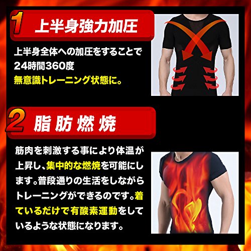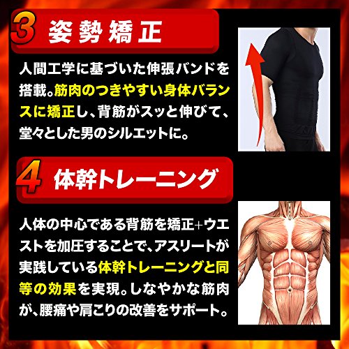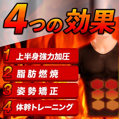 PCに向かうデスクワークが多い方。長時間運転が多い方。 ついつい猫背になったり、お腹周りが気になることはありませんか? 使いやすさを追求し続けた加圧インナー 期待以上の商品をお届けできるよう、何度も試作を繰り返し、とことんこだわり抜きました。 注目の4つの効果 【1】引き締め効果 ゴム以上の伸縮効果を持つ「スパンデックス繊維」によって高い加圧・着圧を実現可能になります。 特に「肩部」「胸部」「腹部」に程よい加圧が施されるように設計されており、常に筋肉を刺激します。 【2】脂肪燃焼 筋肉を刺激することにより、集中的な脂肪燃焼を可能にします。 加圧した状態でトレーニングを行うことで血行が促進されるため 筋力アップ効果とダイエット効果を同時にサポートします。 【3】姿勢改善 身体のバランスが悪いと良い筋肉を生むことは不可能です。 背筋を伸ばすことにより理想な姿勢に矯正します。 【4】体幹トレーニング 人体の中心である背筋が矯正されることにより身体全体の代謝を改善させます。 トレーニング効果が大幅に上昇し、崩れにくい身体を作り上げます。 X着圧ライン+全方向360度圧力バッグ(背中)部分はXラインの着圧加工。 背筋をぐっと引き延ばし、姿勢矯正に優れています。 姿勢が変わると、自身のモチベーションもUP。印象もグッと変わって“できる人”のイメージに。お腹周囲にも背中から肩回りにも効果的に働きかけます。忙しくて中々トレーニングの時間が取れない方でも この着圧インナーを毎日着用することでポッコリお腹やたるんだ脂肪に刺激を与え すっきりしたボデイラインに近づけます。素材にはスパンデックス使用 優れた着圧効果を得るため素材にはスパンデックスを使用。スパンデックスは競泳水着などのスポーツウェアに使用される伸縮性の高い弾性繊維の名称です。 ゴムほどの伸縮性を持ちながら、高い耐久性を備え、カラダにしっかりフィット。 このスパンデックスを使用し、人間工学に基づいたデザインで、男性の体へ強い圧力を加えます。 上半身全体へ圧力を加えることで、仕事、勉強、トレーニング時の集中力がUP。 通気性にも優れており Yシャツの下のインナーウェアとして。 あるいはトレーニング時のエクササイズウェアとして。 様々なシーンで着用していただけます。 吸汗、吸湿性に優れた速乾素材 ・素材 ナイロン90%+スパンデックス10% 優れたパワーストレッチ&ドライ加工の吸汗速乾でサラッとした生地で快適な着心地と高い着圧効果を実感していただけます。 ・対応サイズ 【M】胸囲/66~83cm 【L】胸囲/84~97cm 【XL】胸囲/98~107cm ※サイズ表はあくまで目安です。 より高い着圧効果を求める方はワンサイズ下をオススメします。Feature