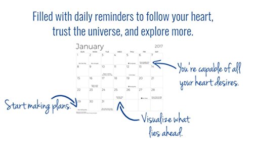 -. Feature : The perfect inspirational gift. / Short, inspirational nets of encouragement each day to follow your heart, trust the universe, and explore more. / 12 stunning photographs of nature and travel destinations around the world to inspire you to GET OUT and explore. / Frameable high-quality photos that can be hung to add beauty to any room. / Features US holidays, phases of the moon, daylight savings, and important observances of the world's major religions.