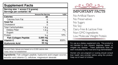 - Feature : Premium pure processed Type I Fish Collagen Peptide powder with Hyaluronic Acid and vitamin C. (Anti-aging protein) / + Improves skin firmness, smoothness, and better moisture retention in skin. / No fillers - Unflavored Collagen Powder - Sugar Free - No Maltodextrin / Prevents deep wrinkles, increases hair and nail quality and growth, improves flexibility. / Made in USA. Money Back Guarantee. SHIPS IN 24 HOURS (no weekends). Certified Halal.