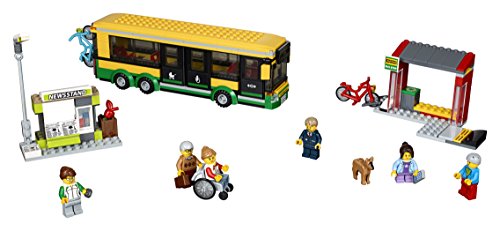 -. Feature : Features a city bus with opening side and front doors, bike rack for 2 bikes on the back, and space inside for 4 minifigures including a wheelchair passenger / Includes 6 minifigures: 2 bus passengers, bus driver, newsstand worker, newsstand visitor and a wheelchair passenger, plus a dog figure / Also includes a bus stop with waiting area, bike stand, Trash can and ramp for a wheelchair, plus a newsstand with an open shelf and space inside for a minifigure, as well as a buildable streetlight / Accessory elements include a briefcase, fruit, 2 drink elements, 3 newspaper tiles and a buildable wheelchair / City bus measures over 2in (7cm) high, 9in (23cm) long and 1in (5cm) wide, bus stop measures over 2in (7cm) high, 3in (8cm) wide and 3in (8cm) deep