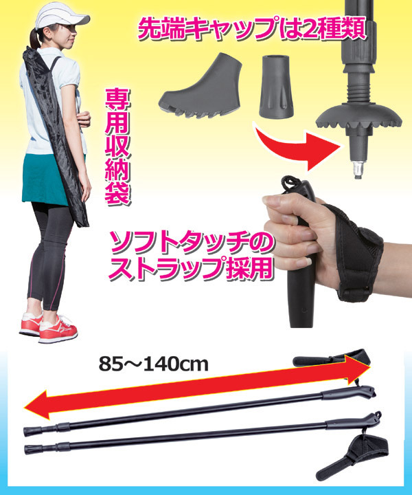 健康維持のために人気のウォーキング運動ですが、上半身の動きがうまくできていない人が多いようです。ウォーキングポールは、歩行時の上半身の動きをテンポ良くし、筋肉を活発に動かすことができる補助具として脚光を浴びています。本製品には、そんなポールにLEDライトを取り付けできるタイプにしてあります。脱着式で角度調節もでき、早朝や夕刻の目印として安全対策にもなります。グリップストラップは長さ調節可能なテーパー形状のものを採用。ポールの長さは無段階で調節でき、男性でも女性でもお使いいただけます。肩に掛けて持ち運びできる専用収納袋付き。