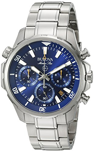 -. Feature : Six hand calendar chronograph in stainless steel with silver-tone finish and blue dial / water resistance to 100 meters / Quartz Movement / Case Diameter: 43mm / Water Resistant To 100m (330ft): In General, Suitable for Swimming and Snorkeling, but not Diving